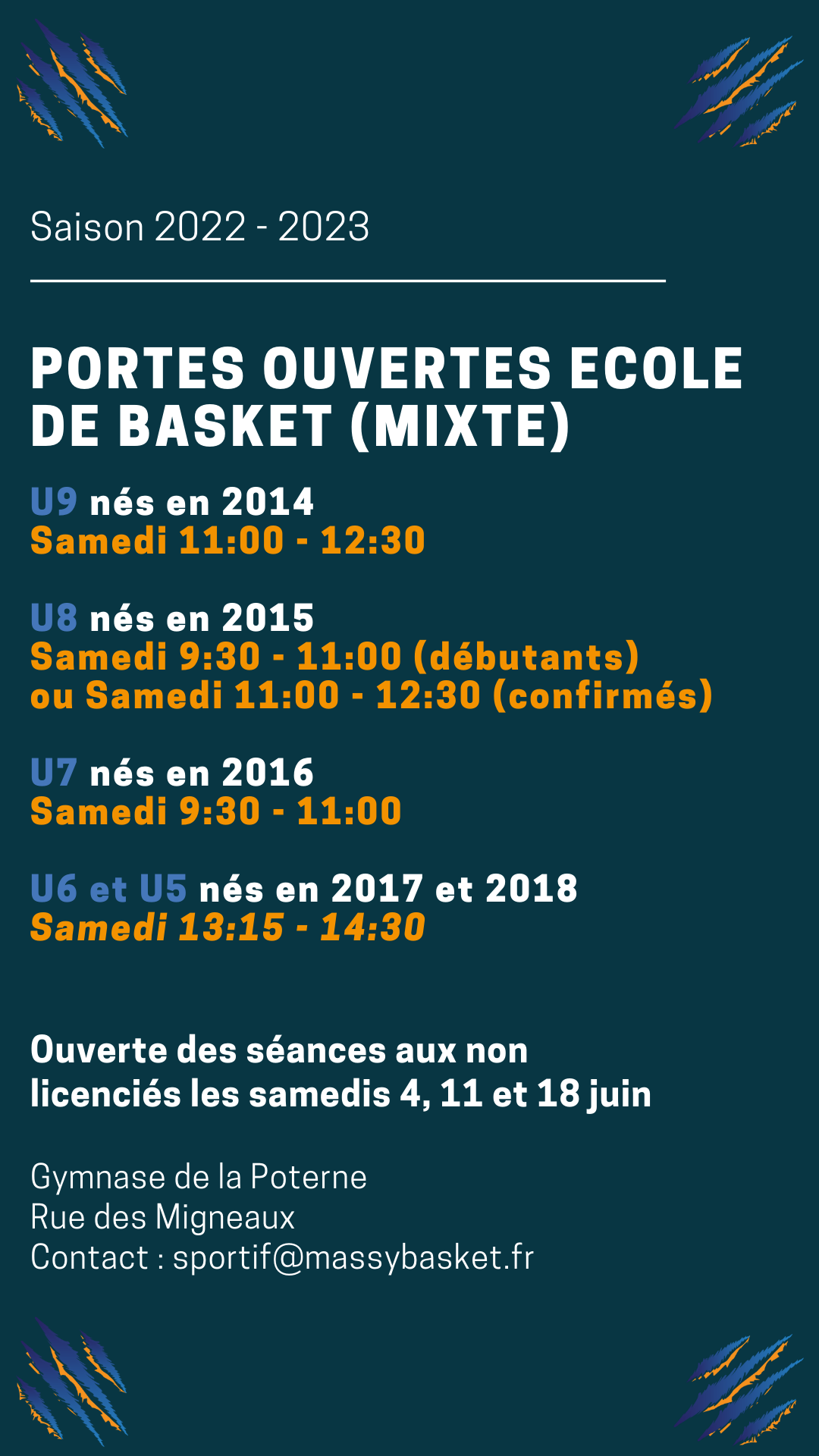 Le Mardi de 17h00 à 18h15, Au Gymnase Desgrolard, 56 Rue de Vilgenis 91300 MassyLe Vendredi de 17h00 à 18h30, Au Gymnase de la Poterne, Rue des Migneaux 91300 Massy