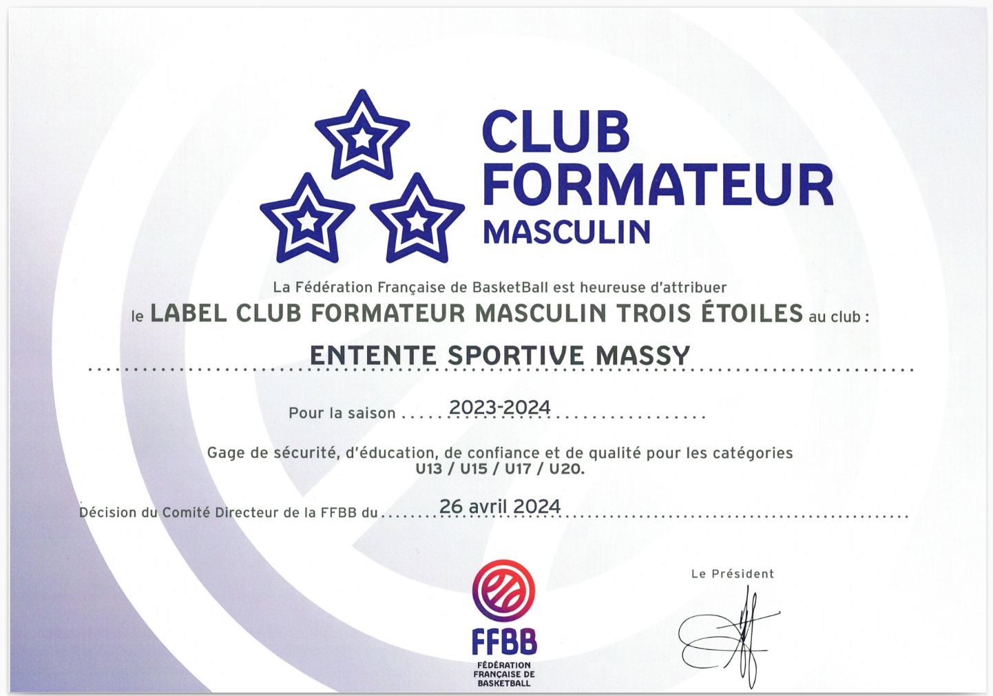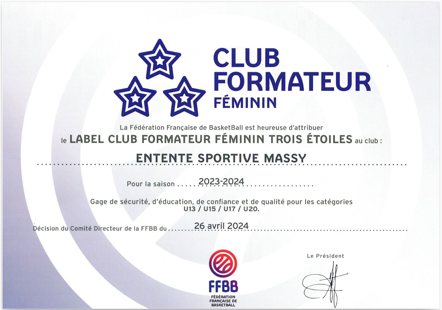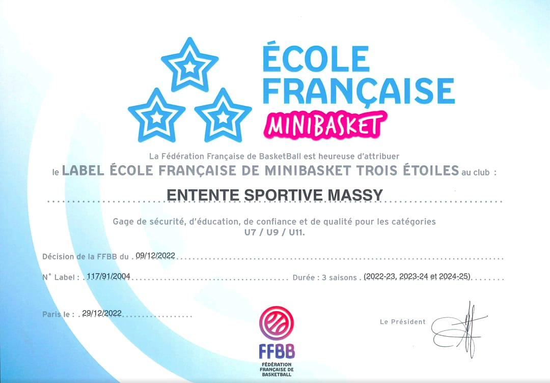 ES Massy Basket-ball Label club formateur *** 3 étoiles Féminin et Masculin en 2024