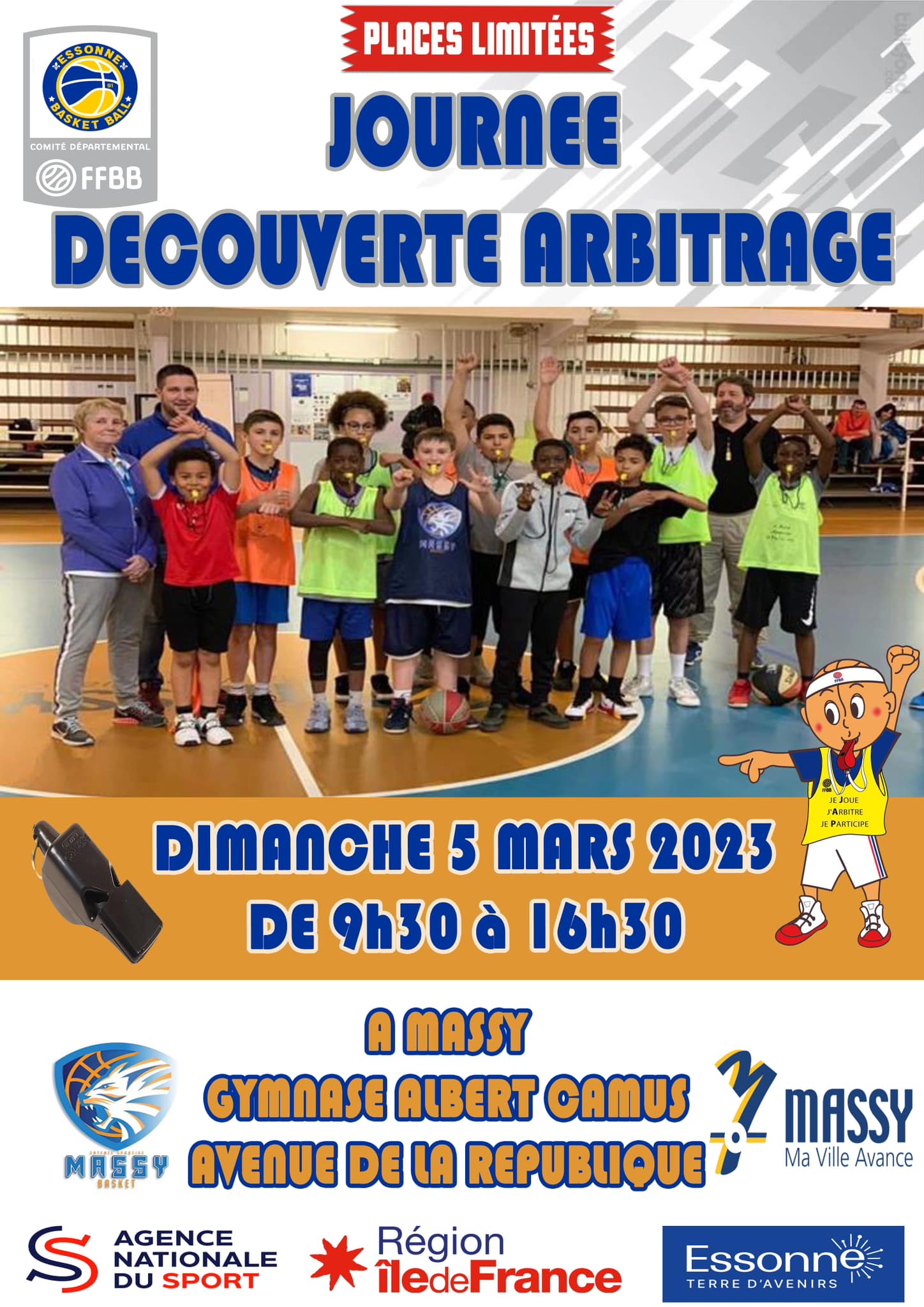 Le lundi de 17h00 à 18h30, Au Gymnase de la Poterne, Rue des Migneaux 91300 Massyle jeudi 17h15 à 18h30, Au gymnase Camus Av de la république 91300 Massy