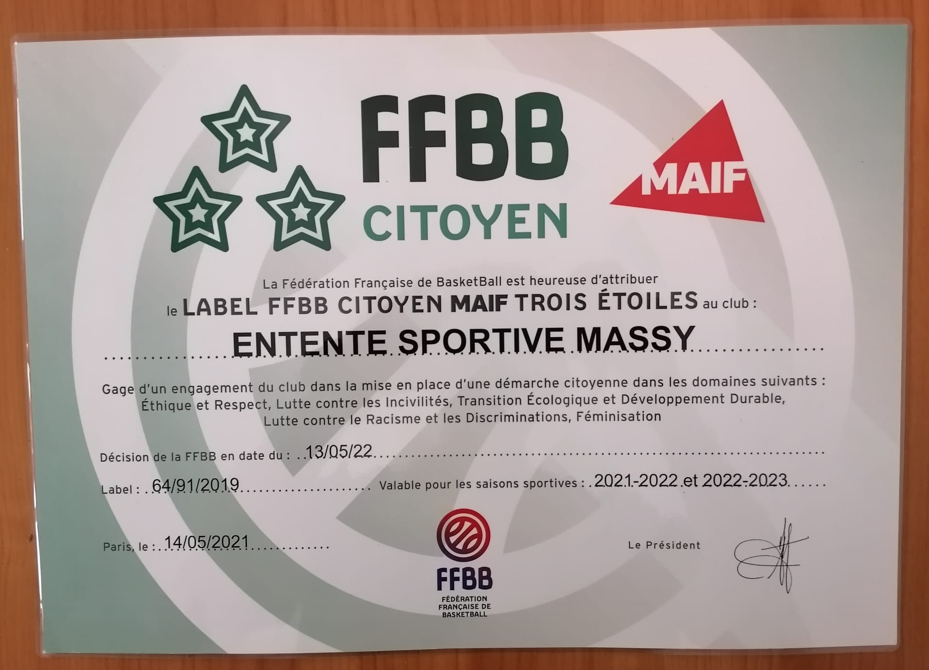 "FFBB Citoyen MAIF" Label 2022 *** 3 étoiles